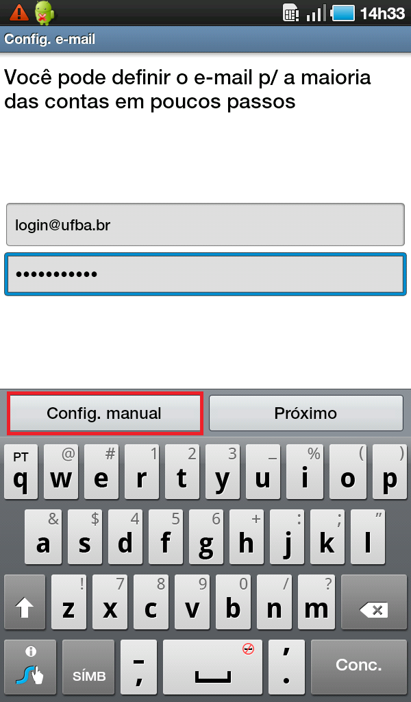 Digite seu e-mail e senha da UFBA e clique em Config manual