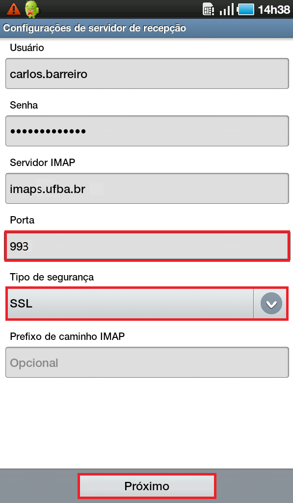 Configurando uma conta IMAP, utilize a porta 993 e o tipo de segurança SSL. Depois clique em Próximo