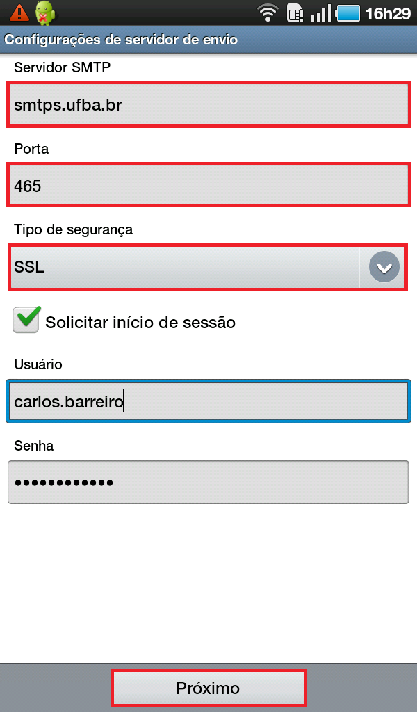 Na configuração do servidor SMTP, utilize o host smtps.ufba.br, porta 465 e o tipo de segurança SSL. Insira seu login e senha da rede e clique em Próximo